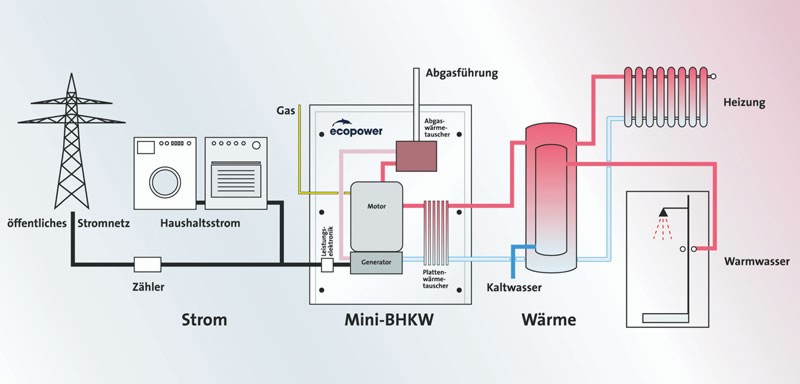 Ein Blockheizkraftwerk ( BHKW ) ermöglicht die dezentrale Erzeugung von Strom und Wärme mit einem kleinen, kompakten Gerät. Nach dem Prinzip der Kraft-Wärme-Kopplung wird die bei der Stromerzeugung entstehende Abwärme direkt vor Ort genutzt. Auf diese Weise nutzt das ecopower Mini-BHKWs die eingesetzte Energie doppelt und erzielt so einen wesentlich höheren Wirkungsgrad als bei der konventionellen Energieversorgung über zentrale Großkraftwerke und das Heizgerät zu Hause.