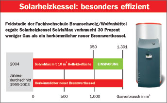Prof. Dr. Dieter Wolff von der FH Braunschweig/Wolfenbüttel: "In einem der untersuchten Gebäude, einem Einfamilienhaus (vier Personen), wurde ein herkömmliches neues Gas-Brennwertgerät gegen den Solarheizkessel SolvisMax ausgetauscht. Der witterungsbereinigte Praxistest ergab 30 Prozent bzw. 3.400 kWh/a weniger Gasverbrauch."