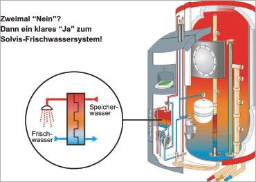 Im oberen Bereich des Speichers wird heißes Wasser entnommen und zu einem Wärmetauscher geleitet. Über diesen Wärmetauscher wird das Frischwasser aus der Leitung wie bei einem Durchlauferhitzer erwärmt. Heißes Speicherwasser fließt am frischen Trinkwasser vorbei und erwärmt es dabei. Und zwar genau so viel und genau so warm, wie Sie wollen. Das heißt: Das heiße Wasser aus der Leitung wird immer frisch zubereitet, sobald Sie den Hahn öffnen. Und das heiße Wasser in Lebensmittelqualität gibt auch beim Duschen und Baden ein gutes Gefühl.